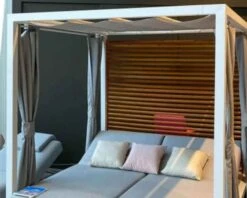 Réalisé avec des matériaux de très haute qualité, il a été réfléchi pour vous apporter un confort maximum et une utilisation plus qu’agréable chaque jour. Son double matelas dispose de têtières inclinables sur plusieurs niveaux. Vous pourrez être totalement allongé(e) pendant que votre conjoint(e) profitera d’être assis afin de pouvoir surfer sur son PC portable. Couvert, votre lit baldaquin vous protégera du soleil en vous apportant également de la fraicheur. Ses teintes éternelles et tendances donnent à votre terrasse un air classe et décontracté à la fois.