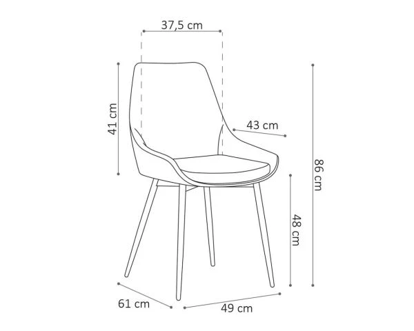 Hauteur : 86 cm – Hauteur d’assise : 48 cm – Largeur : 49 cm – Largeur d’assise : 37,5 cm – Profondeur : 61 cm – Profondeur d’assise : 43 cm