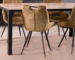 Disponible en 5 couleurs (kaki, moutarde, gris foncé, bleu pétrole et rouille) l’assise « Dina » s’accordera sans souci à votre ambiance. Vous pourrez même vous amuser à combiner deux lots de teintes différentes pour plus d’originalité dans votre salle à manger pourquoi pas. Mais le design de la chaise n’est pas seulement assuré par son tissu me direz-vous. Coutures soignées, poignée haute, piétement compas ultra sobre en fer laqué noir… Ces chaises sont vraiment superbes !