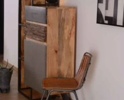 Face à vous, ce meuble présente à gauche une colonne divisée en 3 caissons. Le bois de manguier naturel est sublimé par un encadrement en fer. Vous pourrez facilement y stocker des objets décos, un cadre, des bouquins… Sur la droite du meuble un caisson se farde d’une porte recouverte de métal, de bois exotique surcyclé et de ciment texturé. C’est tellement beau qu’on en oublie presque d’ouvrir la porte pour découvrir un autre module qui sera parfait pour disposer d’autres affaires.
