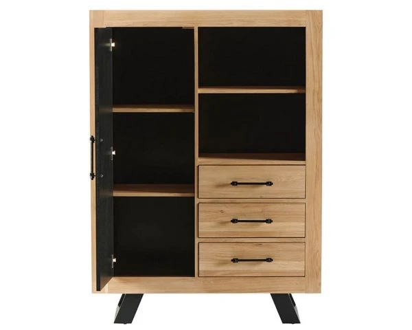 Niveau design, le meuble conjugue avec puissance la couleur naturelle du chêne et la teinte noire. Pieds trapèzes en chêne teinté noir, poignées noires en métal, porte en médium laqué noir… Tout est fait pour faire cohabiter habilement la note pure du bois et la touche industrielle très tendance. Intemporel, ce duo de coloris vous permettra de profiter de votre meuble de salle à manger très longtemps c’est certain. Il servira de toile vierge pour votre créativité sans limite. Et encore plus s’il est accompagné d’autres éléments de la gamme « Davos ».