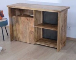 Ce mobilier est une exclusivité Meuble House, créé par notre équipe, et fabriqué par des artisans indiens avec qui nous travaillerons en étroite collaboration. De petites séries sont donc réalisées dans le but de garder toute l’originalité du produit. Ce meuble est proposé à la vente sans vasque. A vous donc de jouer sur l’originalité à ce niveau et d’y apporter votre touche personnelle.