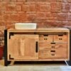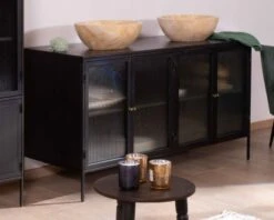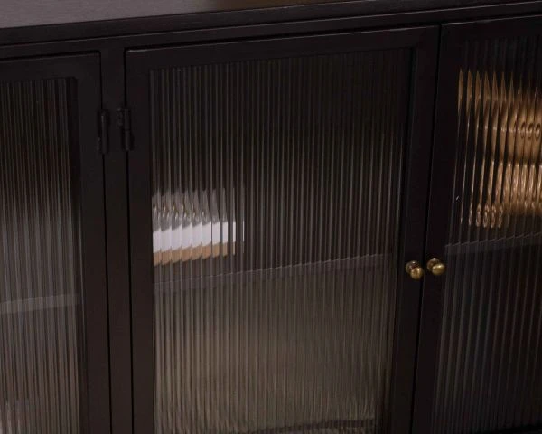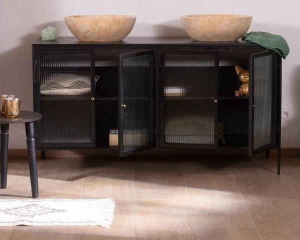 Sortez du lot et démarquez-vous en optant pour un mobilier néo industriel aux références doucement vintages. Le verre cannelé, avec son aspect ondulé à ce je ne sais quoi de rétro qui apporte encore plus de caractère au meuble. Les portes en verre cannelé dissimulent vos affaires tout en les laissant se deviner avec juste ce qu’il faut de curiosité. Les portes, avec leurs poignées boutons s’ouvrent et se referment aisément et restent bien fermées grâce aux aimants. Derrière les 2 doubles portes chaque caisson est séparé par une étagère fixe en fer noir qui vous permet d’augmenter votre stockage.