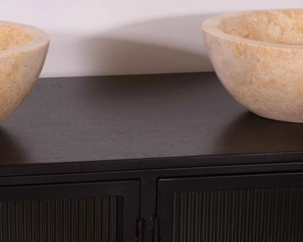 Livré déjà assemblé et avec un retour ouvert à l’arrière pour installer la robinetterie de votre choix, ce meuble de salle de bain noir aux vitres cannelées ne manquera pas de personnalité. Avec son plateau non percé, ce meuble de salle de bain vous laisse le choix d’opter pour les vasques à poser de votre choix pour encore plus de personnalisation. Le caisson de votre meuble a été conçu à partir de bois de manguier massif, très résistant à l’humidité et teinté en noir. Vous pourrez choisir des vasques en céramique noire pour en effet total look ou en verre si vous souhaitez rappeler le matériau des portes. Votre robinetterie pourra aussi être choisie soit dans un esprit très contemporain pour rester dans l’esprit moderne du meuble soit dans une résine black. A vous de voir et de vous amuser ! Car il est évident que ce meuble va vous accompagner durant de longues années. Conçu à partir de matériaux solides et pérennes il ne craindra pas les usages quotidiens et fréquents contrairement à des meubles bas de gamme et standardisés.