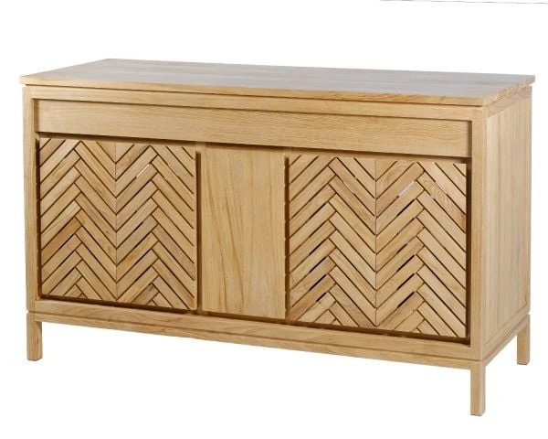Le style ethnique de ce meuble sous vasque en teck massif est souligné par ses façades de portes en chevrons ajourés, élément assez typique porteur d’exotisme et de raffinement qui confère à votre pièce son esprit unique.