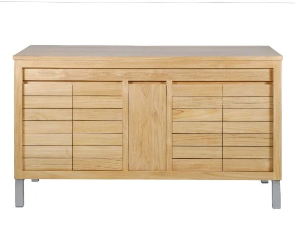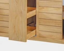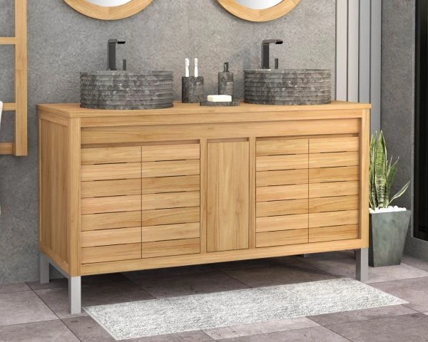 Doté d’une élégance chic et discrète, votre grand meuble de salle de bain de 140 cm accueillera deux larges vasques à poser qui contribueront à sublimer la finesse du veinage du teck massif, essence parfaitement adaptée aux pièces humides.