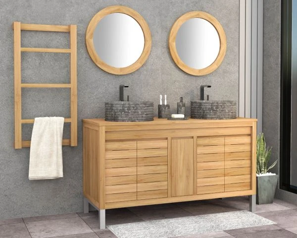 Intégré dans une décoration épurée, alliant une robinetterie moderne, du linge de toilette aux coloris vifs pour dynamiser l’ensemble et des éléments naturels comme de la pierre ou des plantes vertes, votre meuble sous vasque en teck sera le partenaire privilégié de votre bien-être.