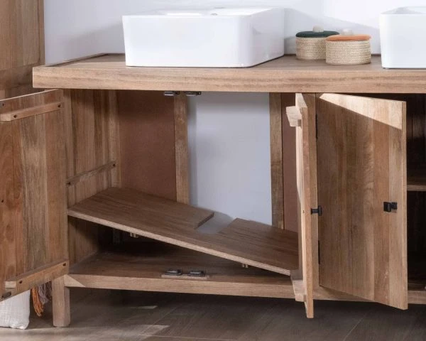 Large de 80 cm sur 56 cm de profondeur, ce meuble sous vasque vous invite à vos rituels de bien-être quotidien en toute simplicité, chaleureusement enveloppés par la douceur exotique du bois de manguier.