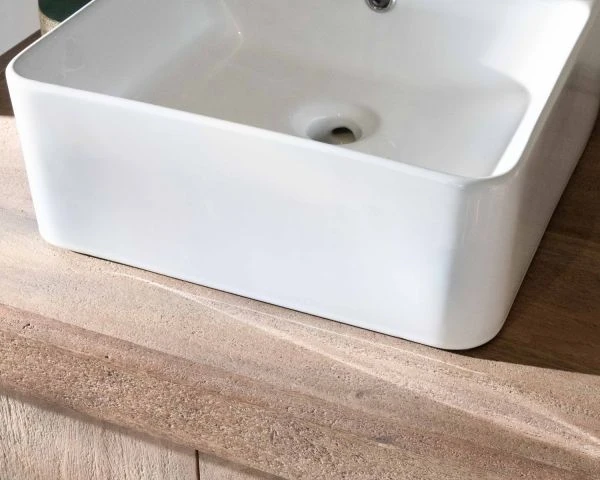 Matières : Bois de manguier massif sablé, contreplaqué (fond du meuble), vasque céramique