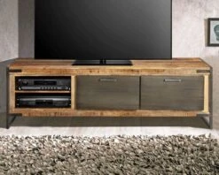 Et si nous commencions par vous présenter ce grande meuble télé avec ses inserts gris ? Avec ses 160 cm de longueur totale, il permet d’installer un grand écran sur sa partie supérieure. Deux niches percées au dos permettront de disposer votre lecteur DVD, votre console ou tout autre appareil high-tech. Dans les deux placards fermés par des portes avec poignées métal, les boites de CDs, les magazines, les manettes… seront bien rangés. Vos affaires trouveront toutes une place à elles et votre chien ne s’amusera plus à manger la télécommande de la box qui trainait là.