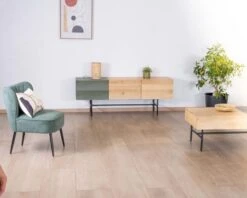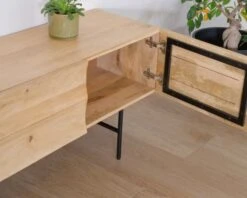 Conçu en bois de manguier massif, ce meuble TV dévoile ses nuances naturelles tout en étant rehaussé d’une couleur vert d’eau rafraîchissante. Cette teinte apaisante, présente sur une des portes, se prolonge subtilement sur le plateau, ajoutant une touche contemporaine et chic. Les nuances naturelles du bois de manguier s’accordent avec ce vert pour créer une ambiance douce et sereine, rappelant les forêts tranquilles et les rivières calmes du Japon.