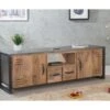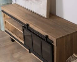 Matières : Pin massif brossé, métal, verre fumé, MDF laqué noir