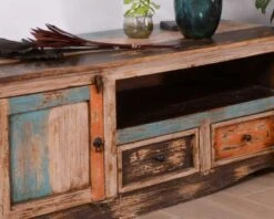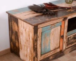 Le meuble TV style récup’ « Cookies » est un exemple de qualité et de longévité. Entièrement réalisé en manguier massif, il se pare d’un généreux placard latéral fermé avec une porte, d’une niche et de deux tiroirs parfaits pour ranger manettes et télécommandes. Le manguier est un bois résistant, qui supporte bien les charges importantes comme un écran de télévision ou des enceintes hi-fi. Ce meuble vous accompagnera donc pendant de longues années, en apportant une belle touche d’originalité à votre pièce grâce à ses nuances de bleu, de bois brut et de rouge orangé.
