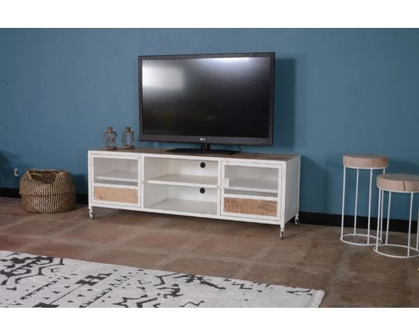 Insufflez une ambiance industrielle à votre déco avec ce meuble TV à roulettes 160 cm de la collection Atelier blanc. Conçu en métal et bois de manguier avec une finition patinée, son design Factory intemporel et authentique apportera une touche de modernité à votre intérieur.