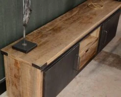 Le meuble TV 160 centimètres appartient à la gamme « Caractère », qui présente une série de meubles pour parachever la décoration industrielle de votre salon : chaises, buffet, table en bois massif, table basse, bibliothèque ou commode. Il existe aussi un autre meuble télé en 180 cm de long.