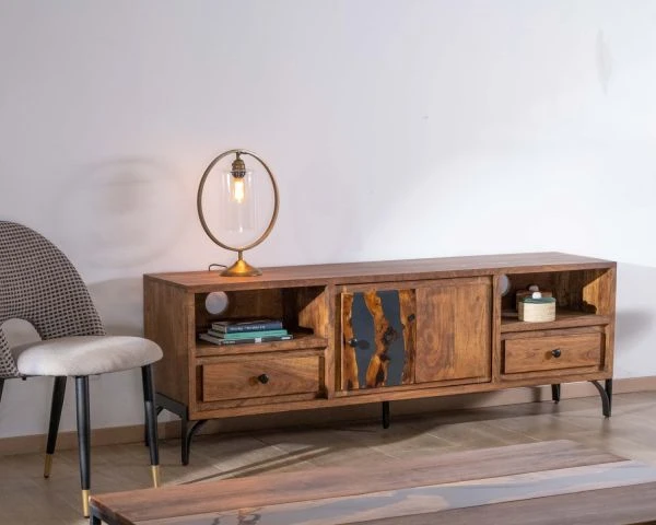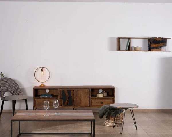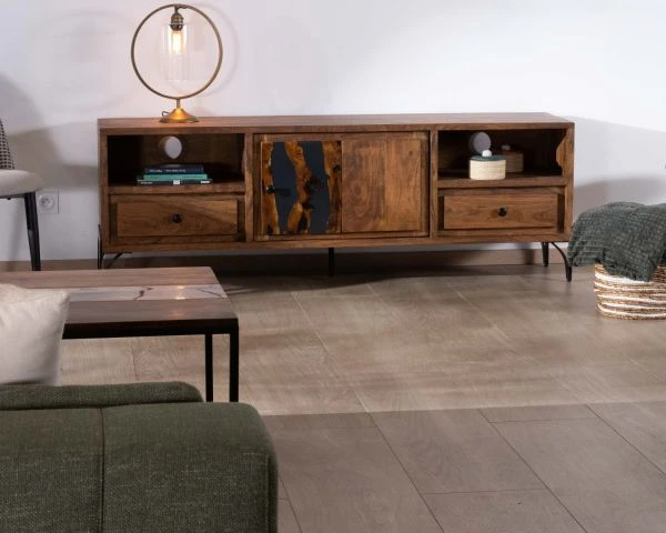 Porteur d’histoire et de cachet, ce meuble télévision est un spectacle à lui seul et vous captivera par l’intrigue des dessins du bois et de la résine, par les reflets du soleil filtrant au travers des rideaux ou de l’éclairage d’ambiance, prémices d’un agréable moment cinématographique.