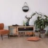 Ce meuble tv en bois mesure 180 cm de long, 43 cm de profondeur et 49 cm de haut. Ces dimensions lui permettent de se placer à la hauteur du canapé et de la table basse, assurant l’unicité du mobilier de votre salon. Sa hauteur est idéale pour regarder la télévision.
