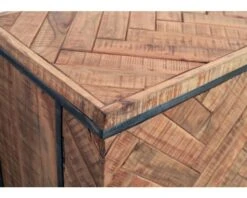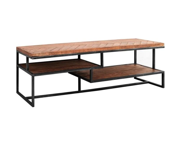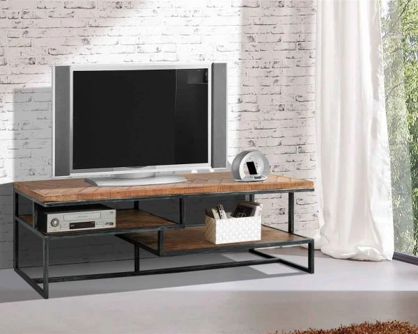 Le plateau à motif chevrons et les étagères suspendues sont recouverts de bois exotique massif qui se marie parfaitement avec la structure en métal. Le tout pour produire une combinaison unique en son genre. Grâce à son association très sobre de matériaux, ce meuble TV saura aisément se combiner avec de nombreuses couleurs de décoration ainsi qu’à des styles d’intérieurs variés : contemporain, scandinave, moderne ou rustique, tout lui va ! Ce meuble s’adaptera sans problème à votre créativité et votre imagination débordante !
