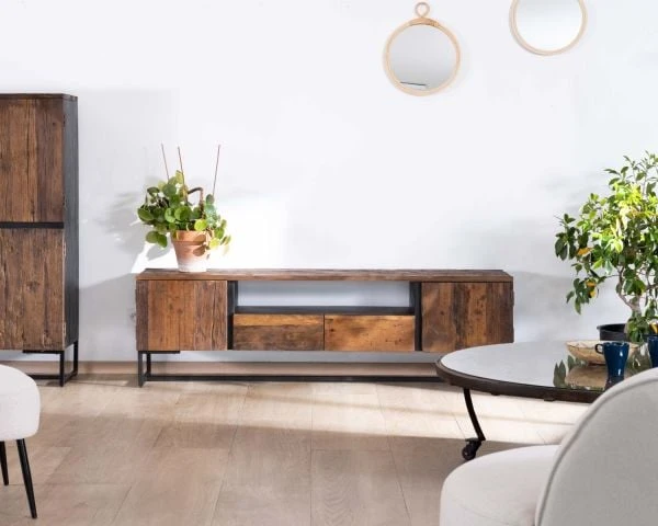 Proposant une longueur impressionnante de 175 cm, une profondeur de 40 cm et une hauteur de 53 cm, ce meuble TV révèlera toute sa majestuosité dans un vaste salon à la décoration industrielle épurée et affirmée, apportant une sensation d’amplitude à votre espace.