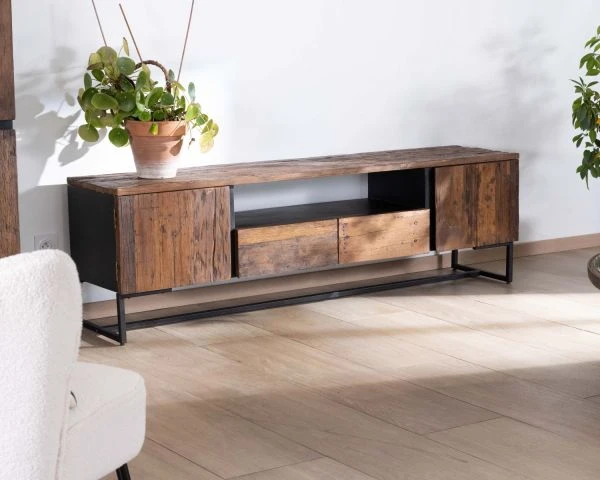 NB : Du fait de l’usage de bois recyclé, le plateau et les façades présentent une finition non lisse, des aspérités, des fissures et des petits défauts qui font partie du charme du meuble.