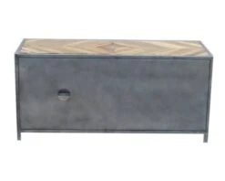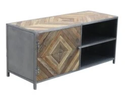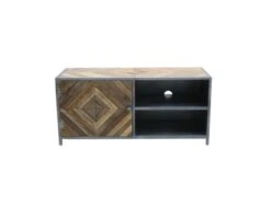 Voici un meuble de télévision original et élégant. Né de l’association de l’acier et du bois exotique, il trouvera naturellement sa place dans une décoration de style industriel. Avec ses jolies dimensions de 120 x 45 x 55 cm, il est aussi compact que pratique. Son plateau supérieur est suffisamment grand pour accueillir un bel écran plat. De multiples lattes de bois recyclé y ont été associées pour créer une figure géométrique en losange.
