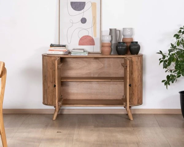 Avec son originalité discrète, ce buffet à doubles portes s’accordera spontanément avec une décoration vintage mais aussi très facilement dans un style contemporain qui pourra se teinter d’ethnique.