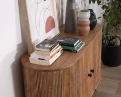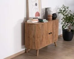 Avec son originale forme ovale, ce bahut rappelle les créations des années rétro. Conçu en bois d’acacia, il offre un plateau lisse et doux au toucher qui met en valeur le veinage naturel de cette essence. Le reste du meuble profite d’une finition crénelée qui contribue à la singularité et à l’esprit vintage qu’il diffuse mais également à la mise en lumière des teintes variées de l’acacia. Ces deux textures s’harmonisent avec délicatesse pour offrir à ce buffet en acacia un aspect cosy.