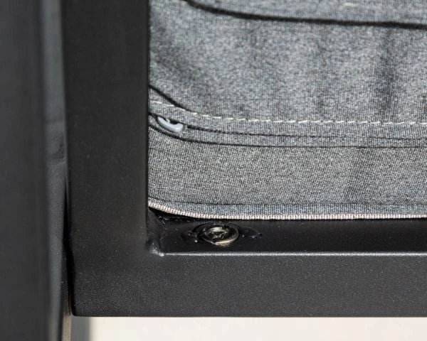 Votre ensemble de mobilier de jardin résolument contemporain et moderne vous attend pour un moment farniente. Que vous le placiez dans votre véranda en hiver ou sur votre terrasse l’été, vous pourrez profiter de ses lignes élégantes et stylées. Le revêtement tissu gris foncé « sooty » du canapé et des fauteuils est une production haute performance de la marque Française Sunbrella® qui confère à vos meubles une résistance aux UV, à la décoloration et aux moisissures. Déperlante, c’est aussi une matière qui s’entretient très facilement. Les coussins garnis d’une mousse respirante sont déhoussables, permettant un lavage aisé et ils peuvent rester dehors même par temps de pluie.