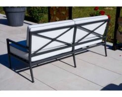 Garnis de mousse antimicrobienne, les deux fauteuils 1 place et la banquette 3 personnes respirent. La condensation est évitée, les meubles sèchent en un temps record même après une bonne averse. Revêtus de tissu performant et hydrofuge Sunproof, les assises sont traitées aussi contre les taches. Le textile s’entretiendra facilement si vous le frottez à l’aide d’une brosse douce et d’eau savonneuse. Un rinçage à l’eau claire et un séchage à l’air libre et vous retrouverez votre mobilier comme neuf.