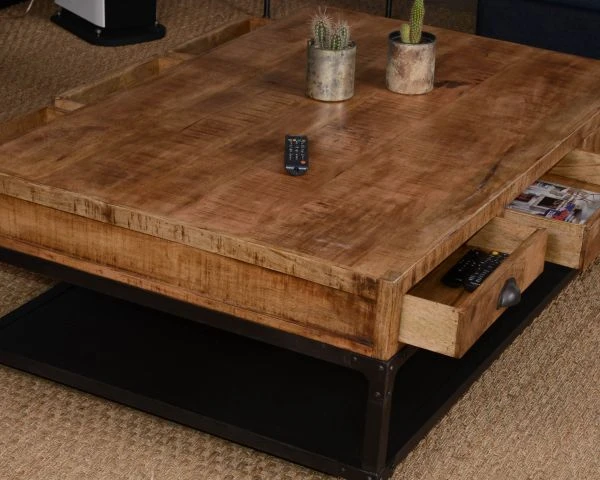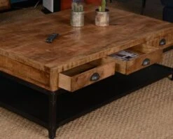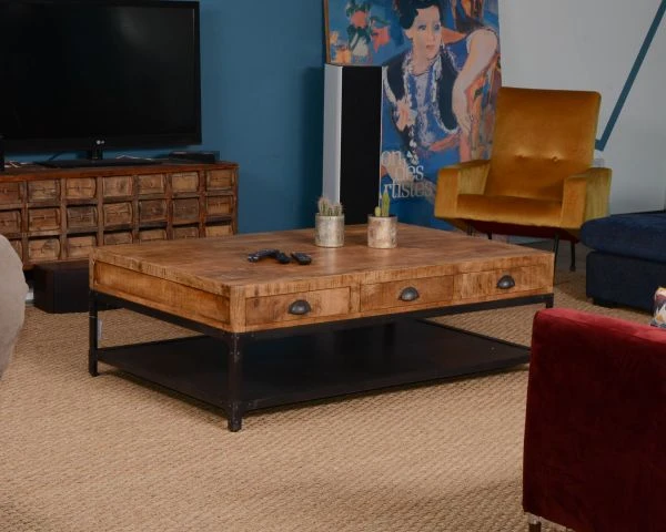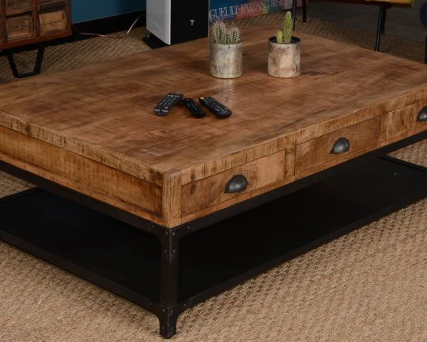 Créez un intérieur à l’atmosphère à la fois chaleureuse et design grâce à cette table basse rectangulaire en manguier massif et métal ! Avec ses six tiroirs, elle vous permettra de garder un salon rangé et organisé en toute circonstance.