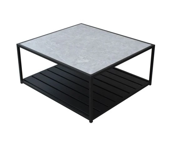 Cette table basse contemporaine possède une structure avec tablette inférieure en aluminium noir et un beau plateau en céramique imitation marbre grisé. L’aluminium est une matière parfaite au jardin car légère et résistante aux intempéries. Vous pourrez laisser sans souci, votre table basse outdoor sur votre terrasse lors des longues soirées estivales et même sous la pluie ou l’orage.