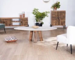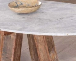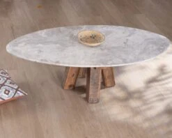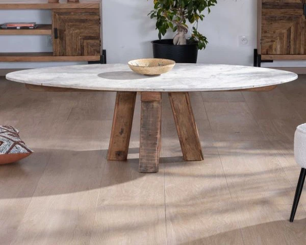 Epurée et pleine de charme, la table basse ovale en pierre et bois recyclé de la collection « Népalaise » dispense un charme hypnotique où se mêle nature et design.