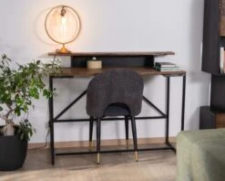 Cet élégant bureau comporte une petite tablette surélevée qui recevra une lampe au design audacieux et un pot à crayons en métal sur le plateau bois et votre nécessaire d’écriture et fournitures usuelles dans la niche du dessous. Pour votre coin informatique, vous pourrez installer un écran d’ordinateur au-dessus tandis que la souris et le clavier trouveront un abri dessous lorsqu’ils ne sont pas utilisés, pour que votre espace de travail reste toujours ordonné et dégagé.