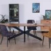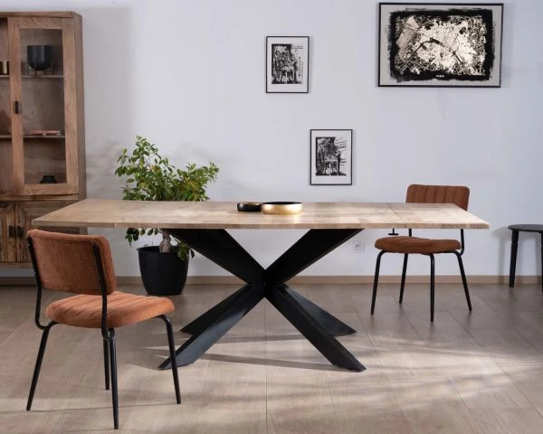 Soutenue par un original piètement en métal noir en croix, la table de salle à manger profite ainsi d’un design affirmé qui se fondra naturellement dans un décor industriel ou plus contemporain.