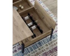 Pour partager un plateau repas en amoureux de manière confortable, les 2 panneaux télescopiques permettront de poser assiettes et couverts et de manger devant votre série télévisée. A l’intérieur de votre table en chêne massif, un support à bouteille permettra de ranger 5 bouteilles de digestif ou de vin* et l’autre caisson d’organiser les différents petits objets dont vous aurez besoin. Briquet, télécommande, tablettes de chocolat, paquets de mouchoirs et autres seront bien à l’abri et vous les aurez à portée de main.