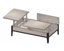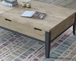 Fabriquée en fer et en chêne, cette table de salon présente un double plateau élévateur et des dimensions de 137 x 39 x 81 cm (long. x haut. x prof.).