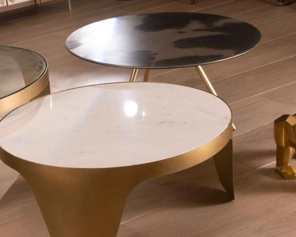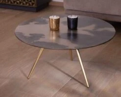 On craque pour cette table ronde au plateau gris argenté gravé, lisse et texturé. Quel rendu ! Et le mariage avec le laiton doré des pieds une vraie réussite !
