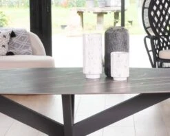 Paré d’un veinage aux nuances de blanc à gris, le plateau en céramique noire évoque l’éternelle beauté du marbre, ajoutant une touche naturelle à cette table de jardin à l’allure raffinée.