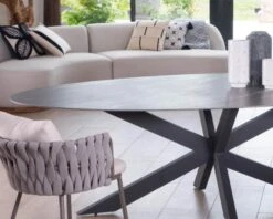 Emerveillez-vous devant cette table d’extérieur elliptique de la collection « Chinon », où le mystère et la profondeur du noir rencontrent une conjugaison audacieuse de matériaux avec une élégance naturelle et épurée.