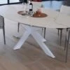 Sa beauté naturelle se suffisant à elle-même, cette table de repas elliptique préfèrera se parer de sets de table en coton écru ou en jonc de mer tressé et de verres aux coloris chatoyants qui mettront en valeur son minimalisme assumé et l’hypnotique veinage du plateau. Ajoutez quelques bougies basses et profitez d’une atmosphère subtilement sophistiquée, harmonieuse et conviviale.