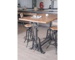 Idéale pour votre cuisine, la table mesure 150 cm de large sur 90 cm de profondeur. Inspiré des tables à dessin des usines de textile, le pied apporte toute l’originalité à cette table très tendance. Le plateau se règle en hauteur, passant d’une table de repas à une table haute à votre guise. Comme les tables à dessin, une seconde manette sur le côté vous permet d’incliner le plateau permettant ainsi de mettre à l’écart le meuble lors de vos soirées et de laisser place à la piste de dance.