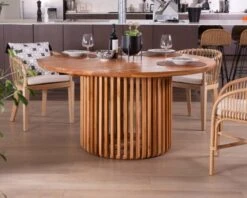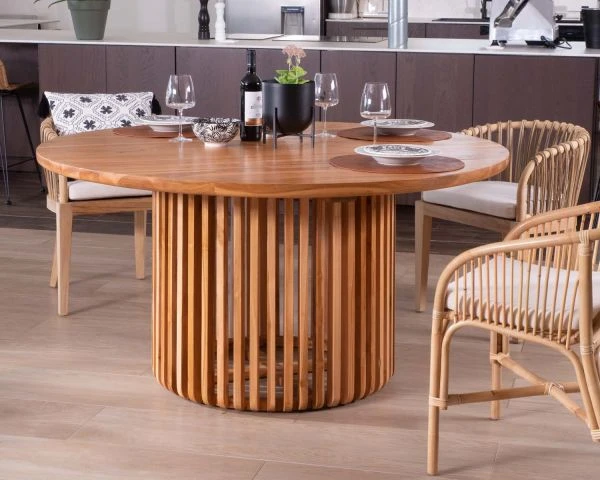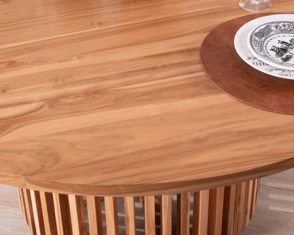 Imprégnez votre salle à manger d’une élégance sophistiquée avec cette séduisante et originale table ronde en teck de 150 cm de diamètre.