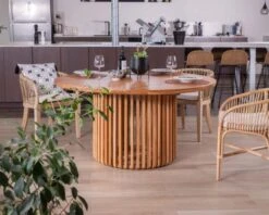 Pour sublimer votre salle à manger, associez cette table avec du mobilier en teck pour un ensemble harmonieux. Jouez avec des couleurs et des textures pour dynamiser votre espace, en disposant sur vos chaises des coussins aux teintes chaudes dans des matières naturelles. Des suspensions design et des miroirs sur les murs apporteront une touche de modernité et de lumière supplémentaire.
