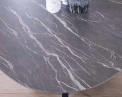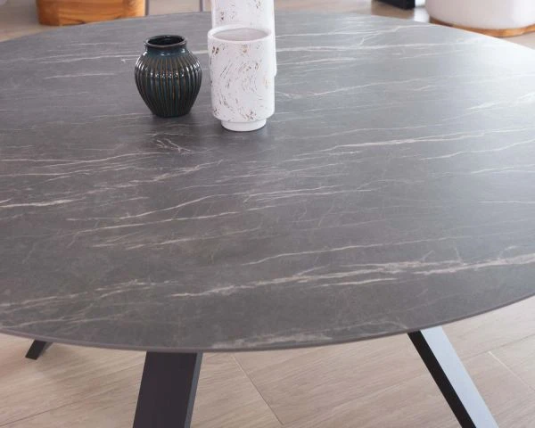 Son plateau en céramique noire, majestueux dans son diamètre de 160 cm strié de veines claires, rappelle ses origines minérales brutes et est un tableau vivant qui vous séduira à chaque regard.
