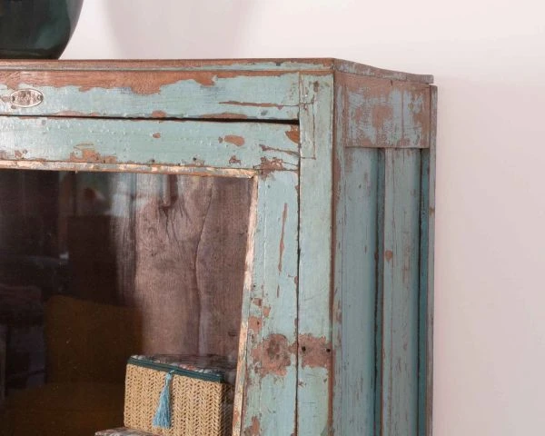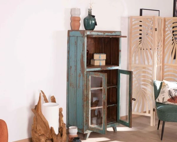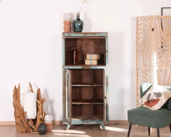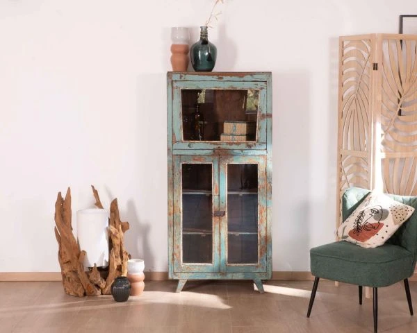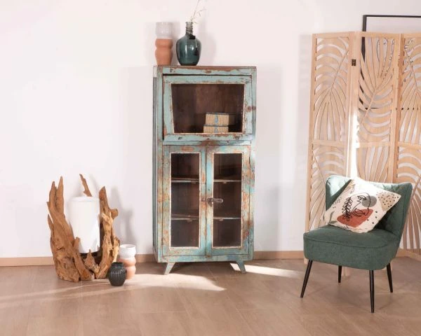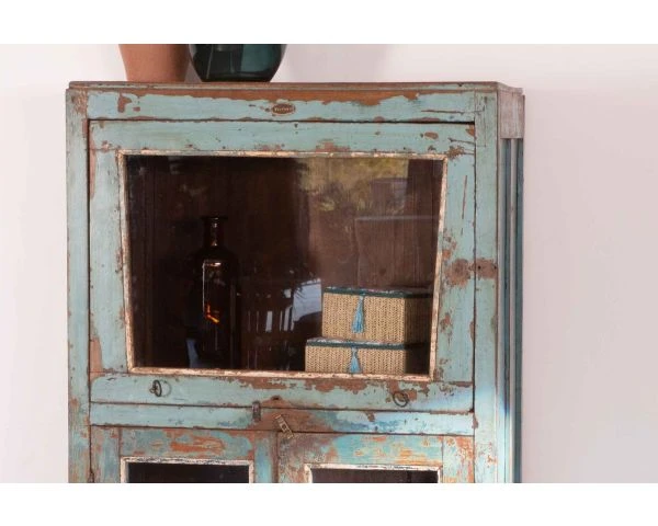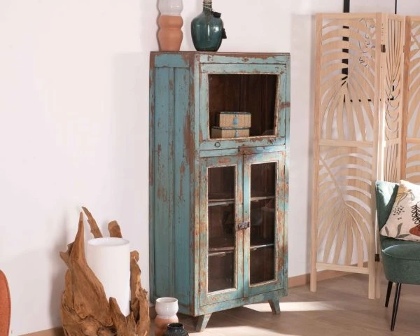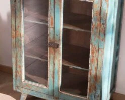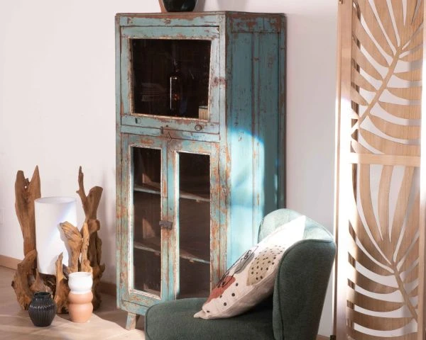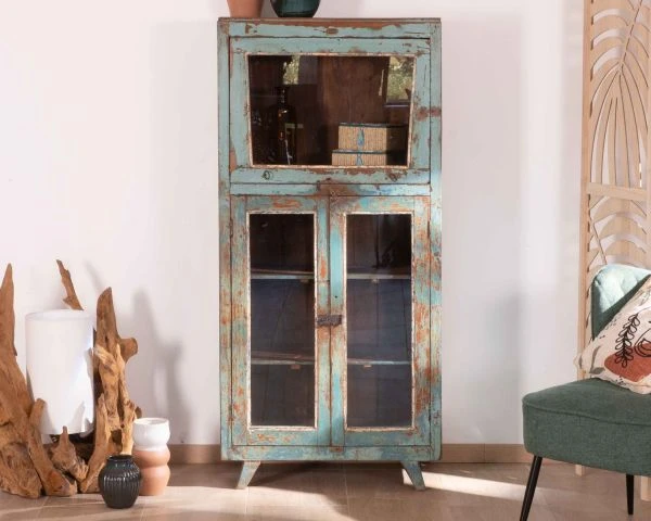 Toutes uniques, les pièces « Batti » signent leur singularité par l’emploi d’anciens bois massifs restaurés avec passion mais qui gardent sur eux la patine du temps et leur histoire. Et cette jolie vitrine bleutée ne dira pas le contraire. Son élégance n’a pas son pareil pour meubler avec délicatesse votre salon, entrée, bureau, patio couvert… Exposez fièrement vos plus belles trouvailles et mettez-les en scène derrière les 3 portes vitrées. Les 2 portes inférieures s’ouvriront sur 2 étagères tandis que la vitre supérieure vous fera profitez d’un large caisson haut. Avec des dimensions de 68 x 38 x 145 cm (longueur x profondeur x hauteur), ce meuble d’appoint trouvera naturellement sa place dans l’espace de votre choix. Si vous aimez l’Inde envoutante, sa belle patine bleue vous fera penser aux rues du Rajasthan dont elle arrive. Vous craquerez pour son allure vintage, ses détails en métal, la couleur naturelle du bois qui ressort par endroit.. Pouvant aussi bien servir de petite bibliothèque, de vitrine, de vaisselier, de meuble d’entrée, de meuble d’appoint… ce meuble a tout bon.