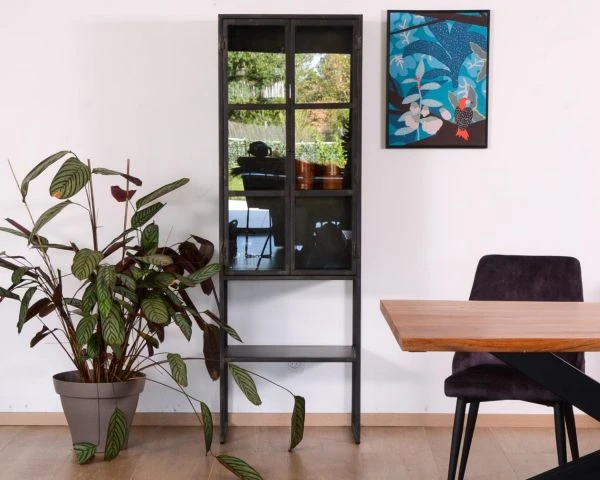 Livrée montée, facile à entretenir, charismatique et se mariant à de nombreux univers, cette jolie vitrine en métal noir est parfaite. On l’associe facilement aux autres meubles de la collection « Black Cook » et on affirme un style fort et puissant dans son appart ou dans sa maison. Le noir allant « avec tout » vous aurez également plaisir à vous amuser avec des accessoires de couleur pour twister votre déco ou vous ferez le choix d’ancrer votre univers dans les codes des ateliers. Murs de briques, sièges en cuir vintage, lampadaire en alu… seront de merveilleux compagnons à ce meuble haut qui, à lui seul, ne manquera pas de susciter l’attention.