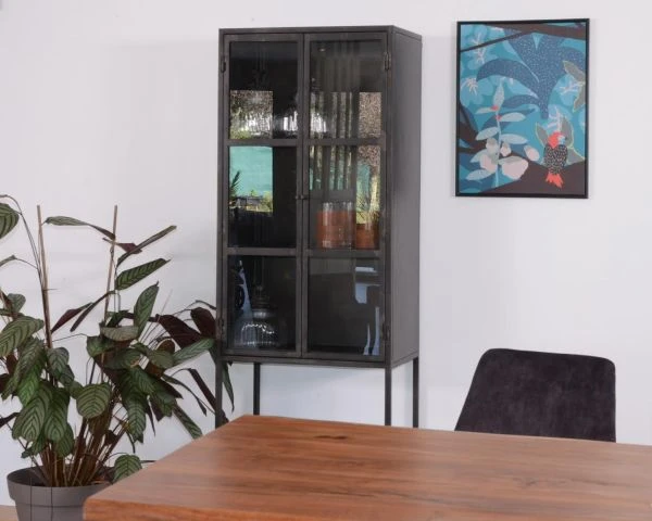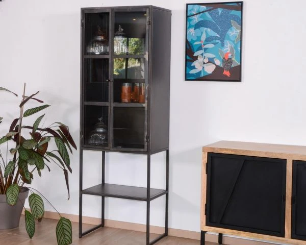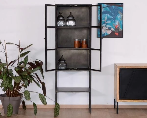 S’inscrivant dans une tendance qui passe sans peine l’épreuve du temps, ce meuble de rangement est idéal pour donner du caractère à votre intérieur. Le petit vaisselier « Black Cook » est conçu à partir d’un métal travaillé dans un style « effet récup » pour une fausse finition usée dans l’air du temps. On dirait un meuble upcyclé mais il n’en est rien ! Cette vitrine factory est solide, durable et faite pour vous accompagner de très nombreuses années. On adore ses deux portes vitrées qui protègent plusieurs étagères également en métal. Sous le caisson haut, un autre niveau vous permet de jouer avec votre déco et de disposer plantes ou paniers africains par exemple.